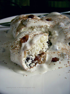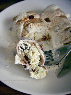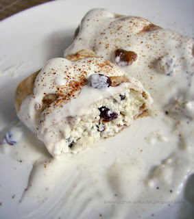 Chociaż książkowo naleśniki z nadzieniem słodkim powinny być składane "w chusteczkę", ja swoje zawinęłam trochę jak krokiety - ruloniki z zamkniętymi bokami.