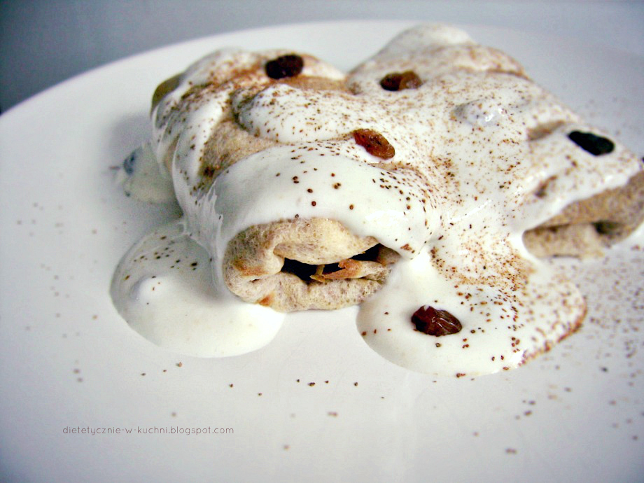 Gotowe naleśniki polewamy jogurtem naturalnym z kardamonem, cynamonem i dodatkową porcją rodzynek.